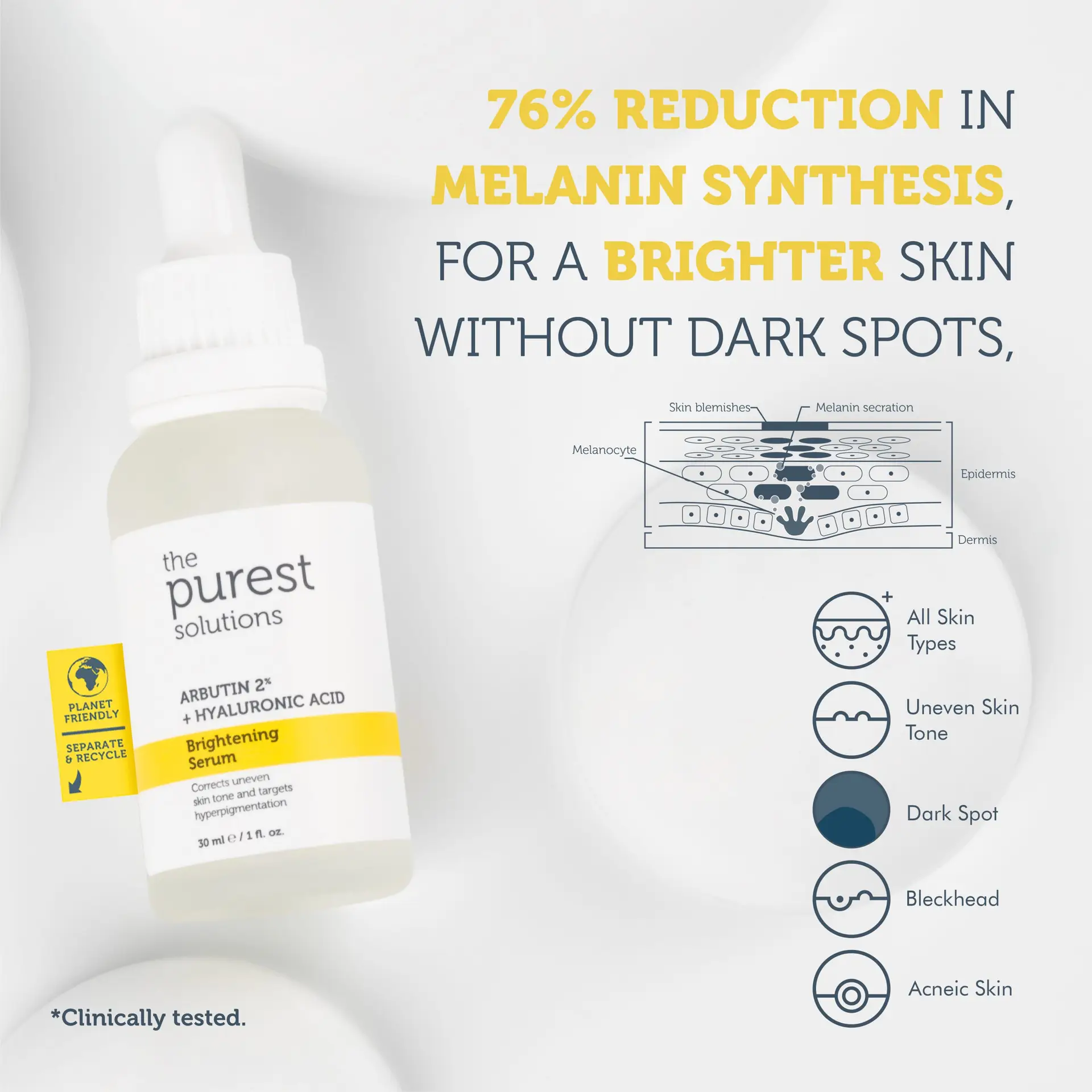 The Purest Solutions Brightening and Anti-Blemish Arbutin Skin Care Serum is a brightening serum that reduces pigmentation, evens skin tone, and hydrates the skin.